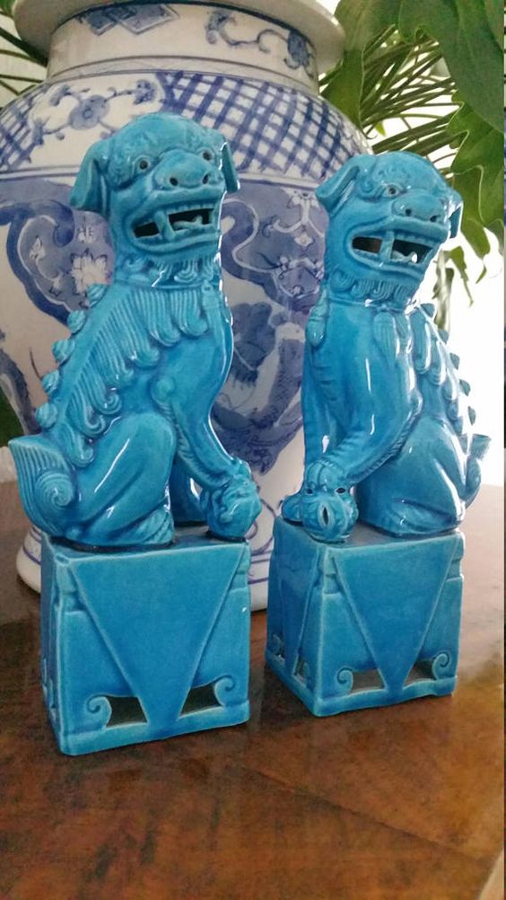 I have always loved turquoise blue foo dogs. They mix beautifully with blue and white Chinese porcelain like ginger jars. The color works especially well in a beach house.
